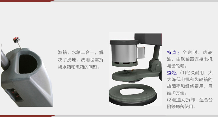 泡箱、水箱二合一,解決了洗地、洗地毯需拆換水箱和泡箱的問(wèn)題。